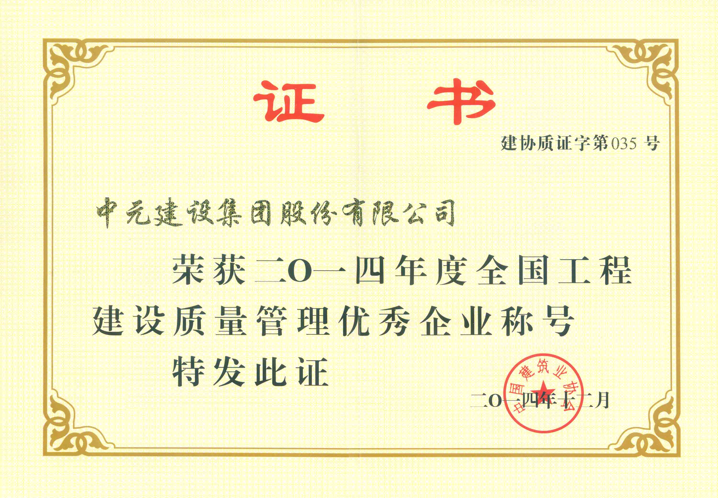 • 2015年度全国工程建设质量管理优秀企业荣誉证书
