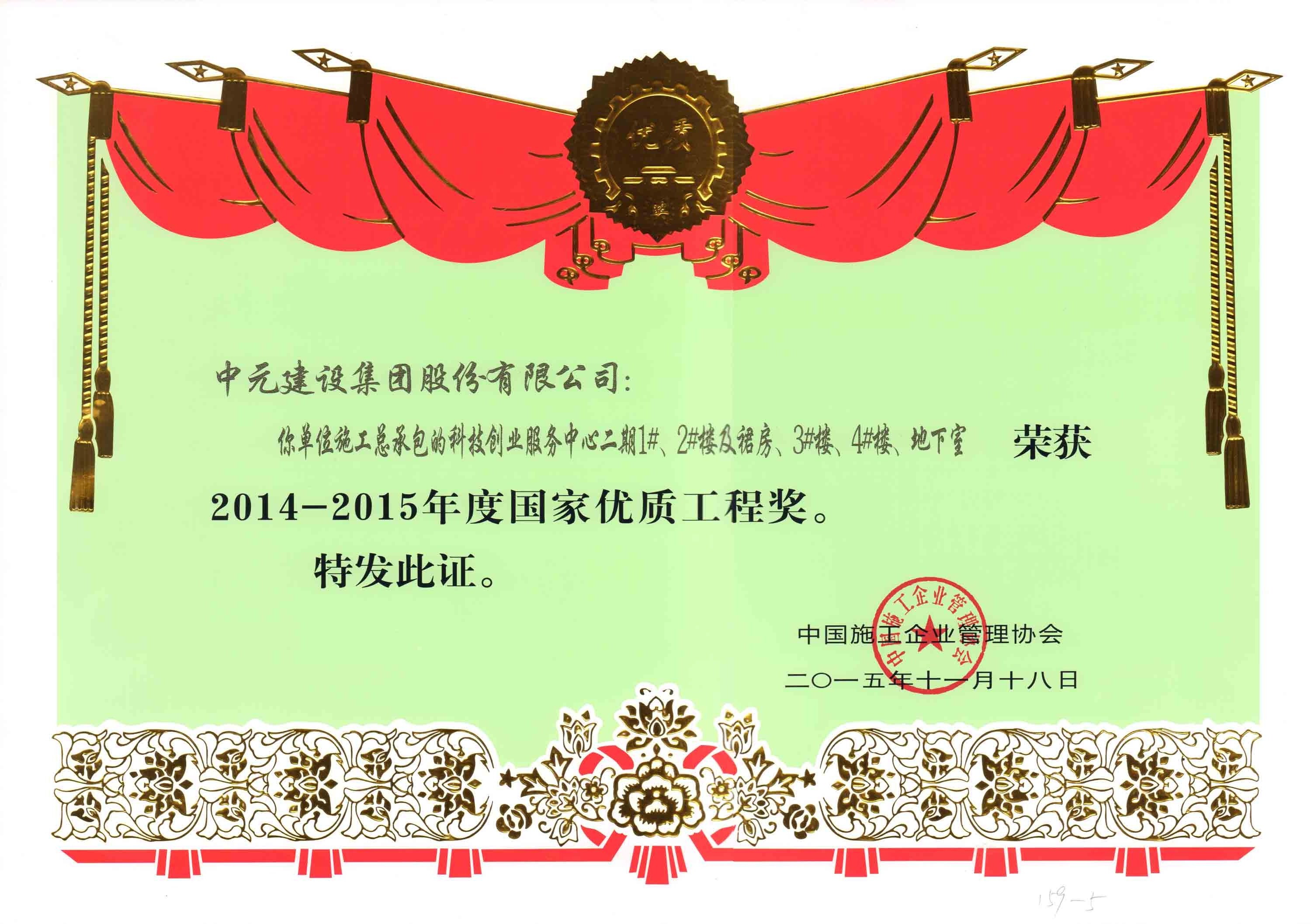 • 国家优质工程(2014-2015)荣誉证书