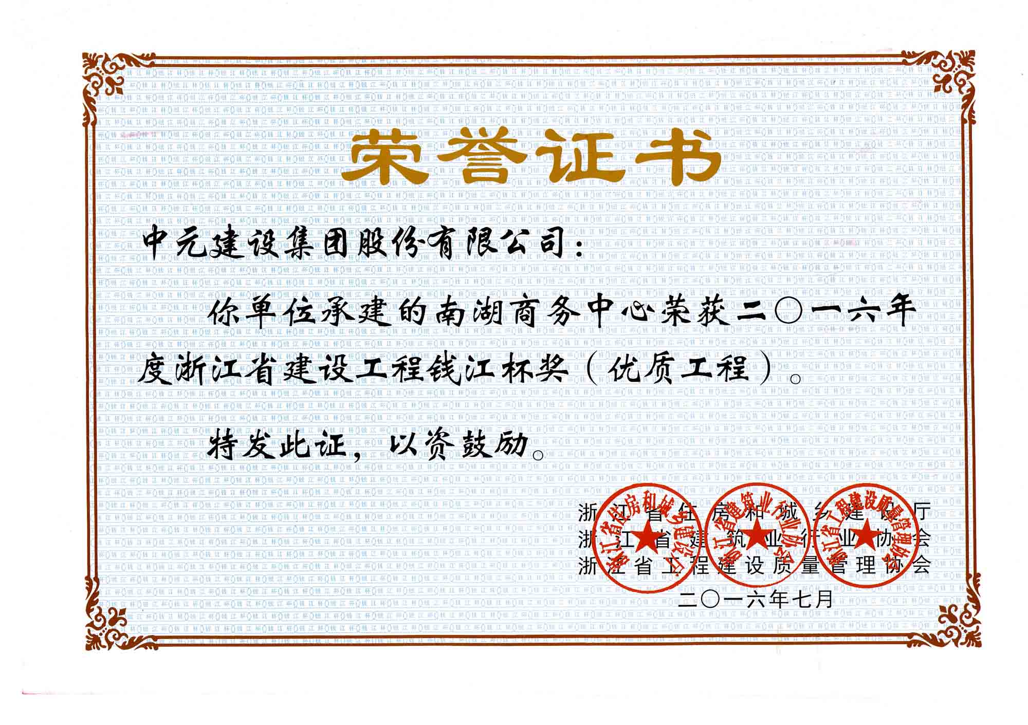 • 2016年度浙江省建设工程钱江杯(优质工程)南湖商务中心