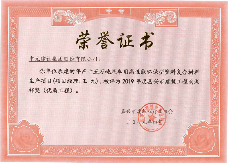 • 2019年度嘉兴市建筑工程南湖杯奖(优质工程)年产十五万吨汽车用高性能环保型塑料复合材料