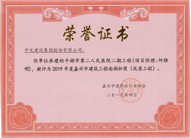 • 2019年度嘉兴市建筑工程南湖杯奖(优质工程)平湖市第二人民医院二期工程