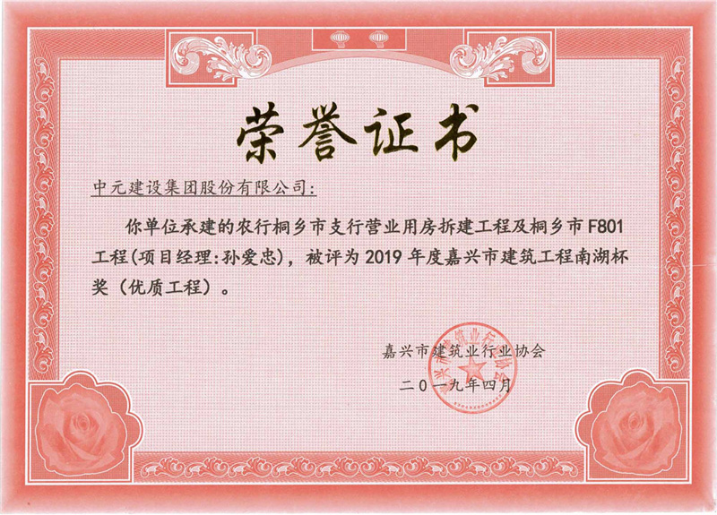 2019年度嘉兴市建筑工程南湖杯奖(优质工程)农行桐乡市支行营业用房拆建工程及桐乡市F801工程