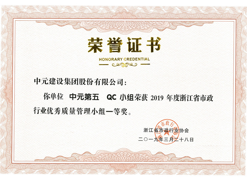 2019年度浙江省市政行业优秀质量管理小组一等奖(中元第五QC小组)