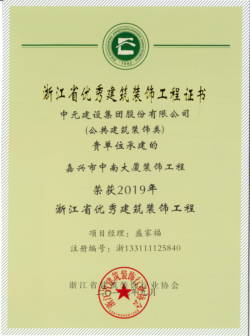 2019年浙江省优秀建筑装饰工程(嘉兴市中南大厦装饰工程)