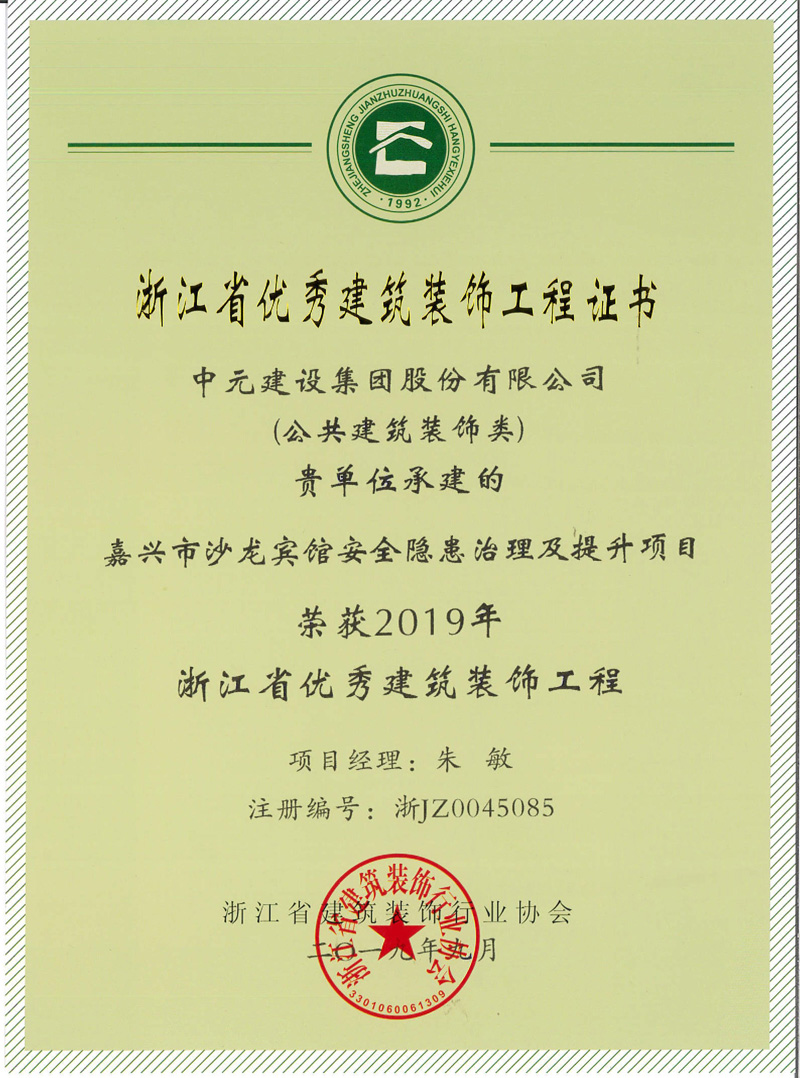 2019年浙江省优秀建筑装饰工程(嘉兴市沙龙宾馆安全隐患治理及提升项目)