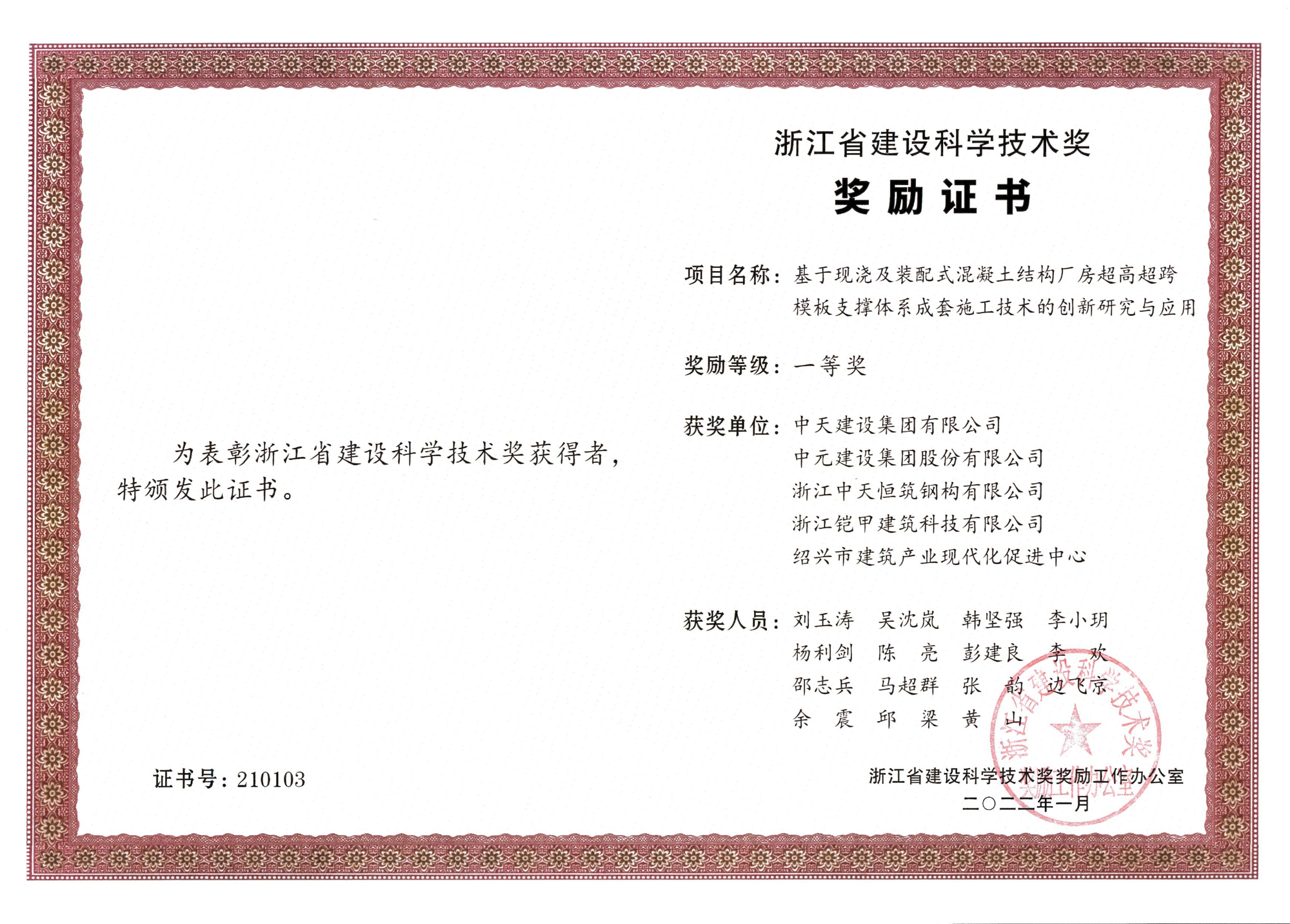 2021年浙江省建设科学技术奖(基于现浇及装配式混凝土结构厂房超高超跨模板支撑体系成套施工技术的创新研究与应用)个人
